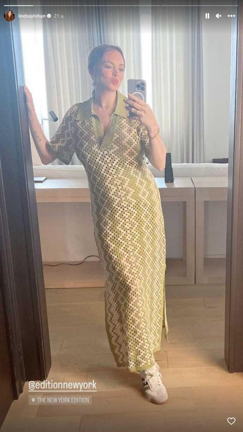 Nu deelde de 36-jarige ‘Mean Girls’-actrice een selfie waarop haar babybuikje al een beetje te zien is. Ze trok die foto in het luxehotel ‘New York Edition’ in New York City, waar ze op vakantie verblijft met haar zus Aliana.