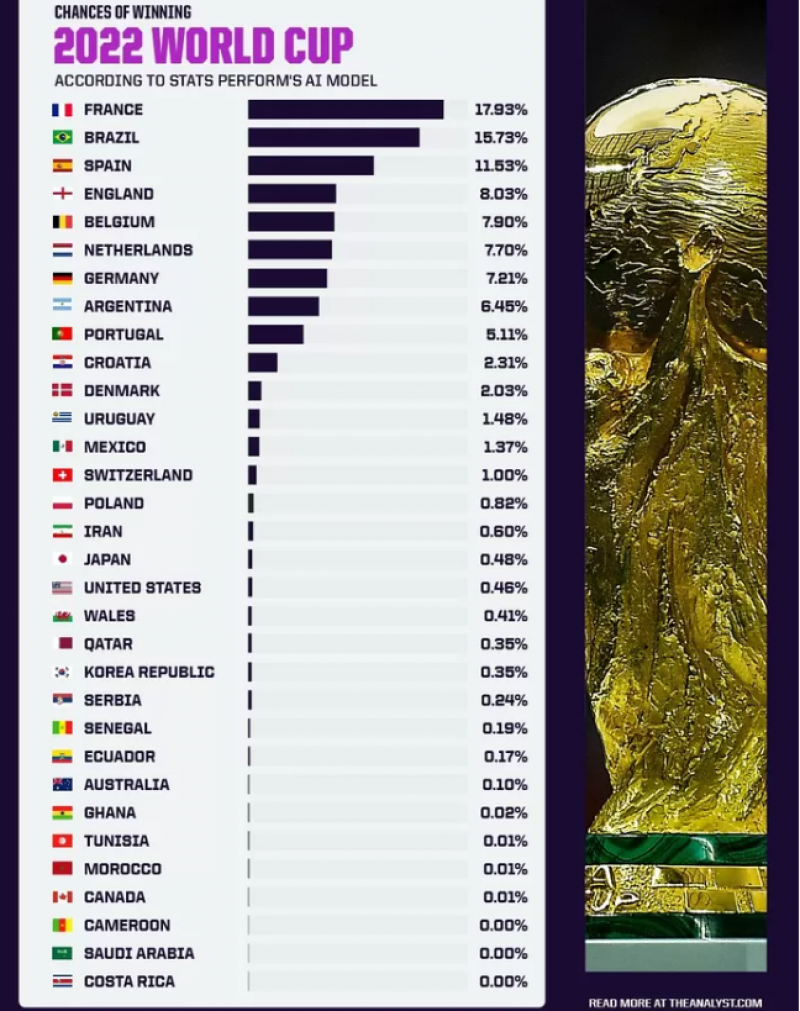 Volgens de supercomputer maken Courtois, De Bruyne, Lukaku en co. eind dit jaar 7,90% kans om wereldkampioen te worden in Qatar. Daarmee staan we op de vijfde plek, na Engeland (8,03%), Spanje (11,53%) en Brazilië (15,73%). Frankrijk staat met 17,93% helemaal bovenaan.