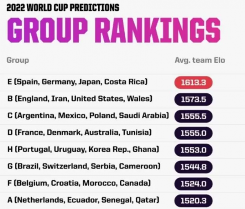 Dat de Rode Duivels de vijfde meest kansrijke kandidaat zijn voor het wereldkampioenschap hebben ze vooral te danken aan hun relatief ‘gemakkelijke’ poule in de groepsfase. Zo is onze groep F met naast België Kroatië, Marokko en Canada de tweede gemakkelijkste groep volgens de supercomputer. Marokko en Canada krijgen elk immers maar een kans van 0,1% toegedicht om met de wereldbeker naar huis te gaan. Onze noorderburen hebben het met hun groep A nog gemakkelijker dan ons land, groep E (Spanje, Duitsland, Japan, Costa Rica) is dan weer ‘De groep des doods’.