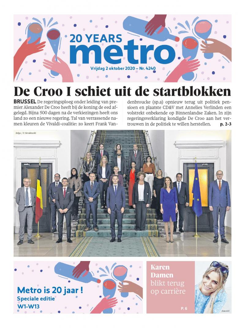 Metro gaat zijn twintigste jaargang in. Dat vieren we met een nieuwe lay-out en een iets kleiner half-berlinerformaat. Onze feesteditie bewaren we voor vrijdag 2 oktober. Daarin blikt onze toenmalige manager Monique Raffeels terug op het rattenincident en brengen we een ode aan onze Metrosaurussen Wernus, Pierus en Lievus. Die collega’s houden het op dat moment al bijna 20 jaar bij ons uit. Dat onze journalisten het ook al eens bij het verkeerde eind hebben bewijst onze modejournalist: zij doet in onze terugblik op de jaren 2000 Juicy Couture af als een «modeblunder».