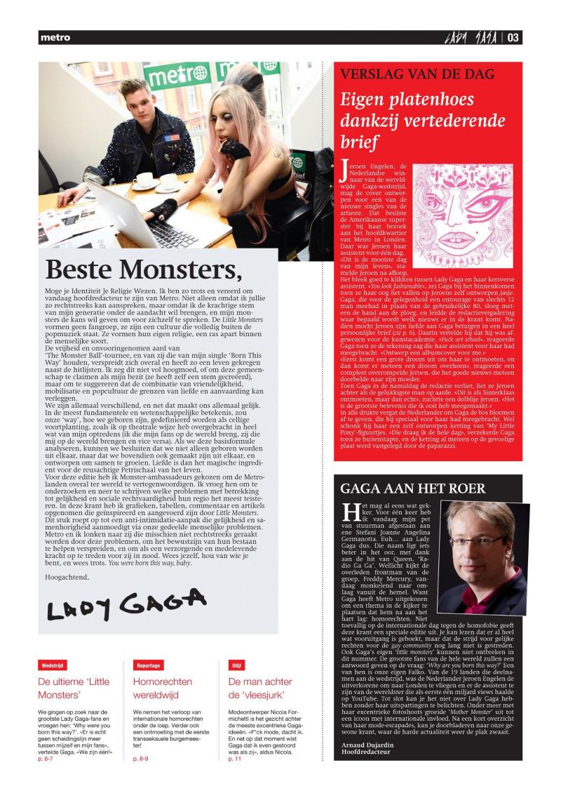 Op de top van haar carrière brengt Lady Gaga niet alleen het iconische ‘Born This Way’ uit, ze gaat ook aan het roer van Metro zitten. Voor één dag stuurt ze als hoofdredacteur de redactie aan vanuit Londen. De ‘Pokerface-editie’ legt de focus op homorechten, Gaga’s Little Monsters en de man achter de vleesjurk. «Wees jezelf, hou van wie je bent, wees trots», moedigt ze onze lezers aan. Gaga was overigens niet onze enige gasthoofdredacteur: ook Virgin-ondernemer Richard Branson en mode-icoon Karl Lagerfeld nemen die rol op in 2012.