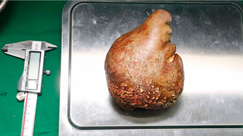 Ter vergelijking: de niersteen heeft de vorm van een pompelmoes, is zo lang als een banaan en zo zwaar als vier hamsters. Niet niets om elke dag met je mee te sleuren, nietwaar?