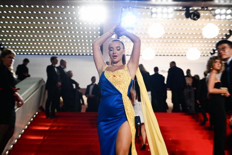 Een vrouw die gekleed was in een jurk met de kleuren van de Oekraïense vlag, heeft zondagavond een opvallende actie gevoerd op het filmfestival van Cannes. Ze sprong de rode loper op en scheurde boven haar hoofd zakjes met nepbloed open.